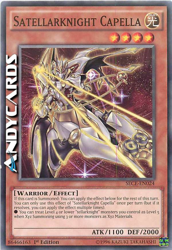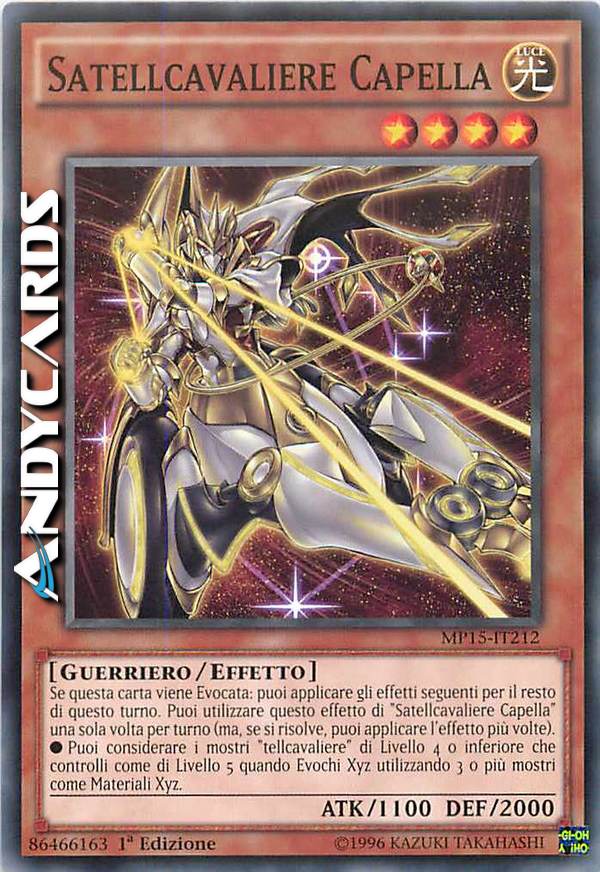 Se questa carta viene Evocata: puoi applicare gli effetti seguenti per il resto di questo turno. Puoi utilizzare questo effetto di "Satellcavaliere Capella" una sola volta per turno (ma, se si risolve, puoi applicare l'effetto più volte). • Puoi considerare i mostri "tellcavaliere" di livello 4 o inferiore che controlli come di Livello 5 quando Evochi Xyz utilizzando 3 o più mostri come Materiali Xyz.