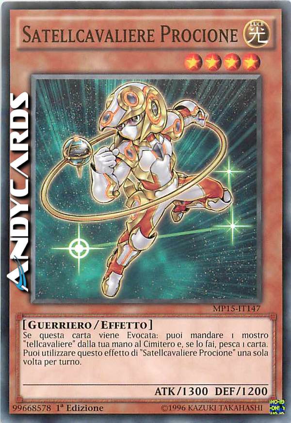 Se questa carta viene Evocata: puoi mandare 1 mostro "tellcavaliere" dalla tua mano al Cimitero e, se lo fai, pesca 1 carta. Puoi utilizzare questo effetto di "Satellcavaliere Procione" una sola volta per turno.