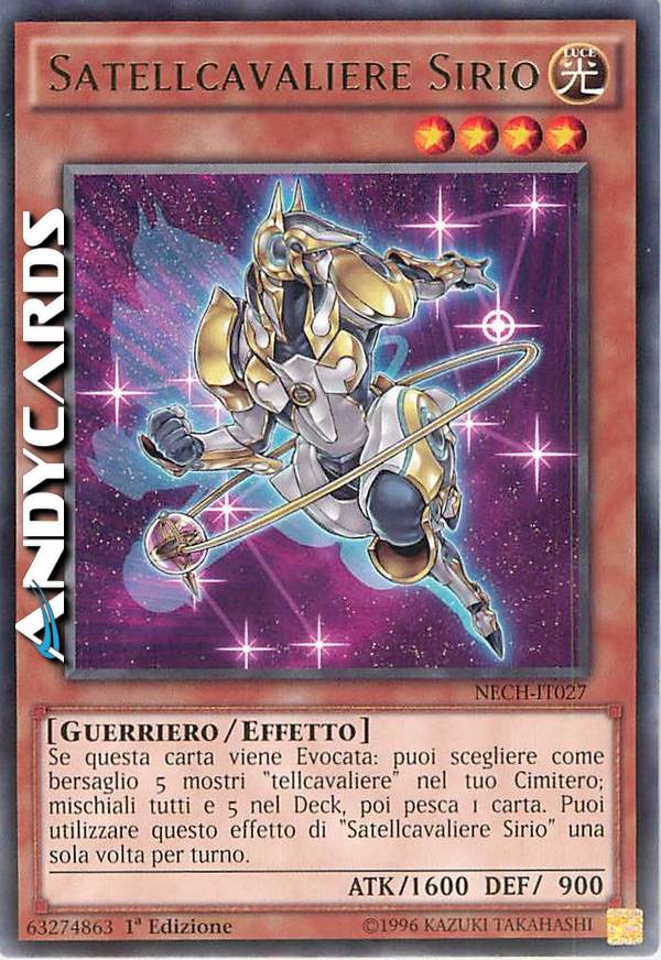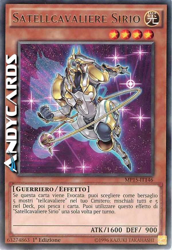 Se questa carta viene Evocata: puoi scegliere come bersaglio 5 mostri "Tellcavaliere" nel tuo cimitero; mischiali tutti e 5 nel Deck, poi pesca 1 carta. Puoi utilizzare questo effetto di "Satellcavaliere Sirio" una sola volta per turno.
