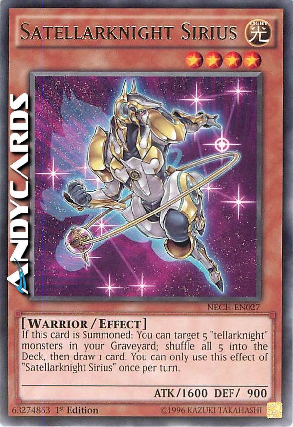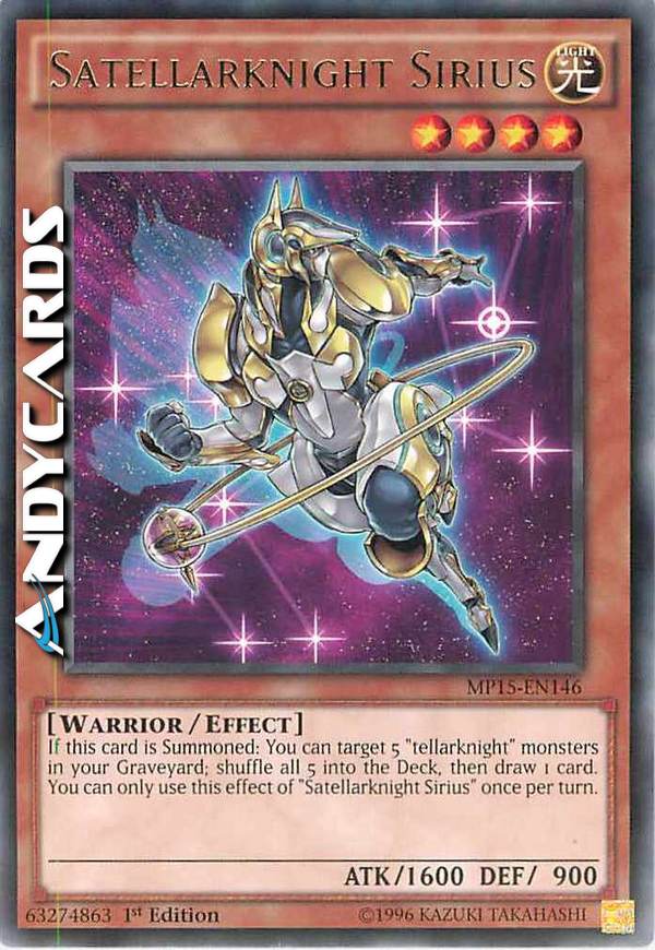 If this card is Summoned: You can target 5 "tellarknight" monsters in your Graveyard; shuffle all 5 into the Deck, then draw 1 card. You can only use this effect of "Satellarknight Sirius" once per turn.