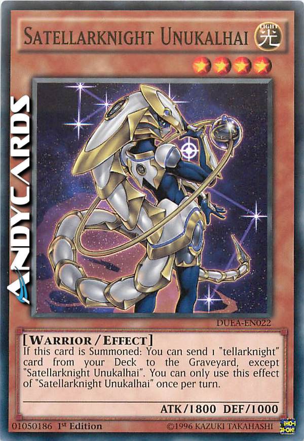 If this card is Summoned: You can send 1 "tellarknight" card from your Deck to the Graveyard, except "Satellarknight Unukalhai". You can only use this effect of "Satellarknight Unukalhai" once per turn.