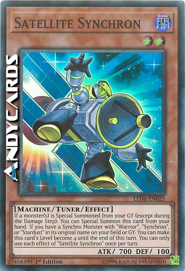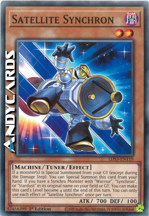 Se uno o più mostri vengono Evocati Specialmente dal tuo Cimitero (eccetto durante il Damage Step): puoi Evocare Specialmente questa carta dalla tua mano. Se hai un Mostro Synchro con "Guerriero", "Synchron" o "Polvere di Stelle" nel suo nome originale sul tuo Terreno o Cimitero: puoi far diventare 4 il Livello di questa carta fino alla fine di questo turno. Puoi utilizzare ogni effetto di "Satellite Synchron" una sola volta per turno.