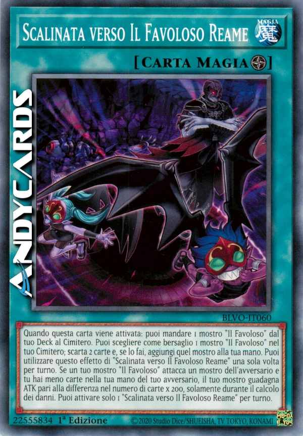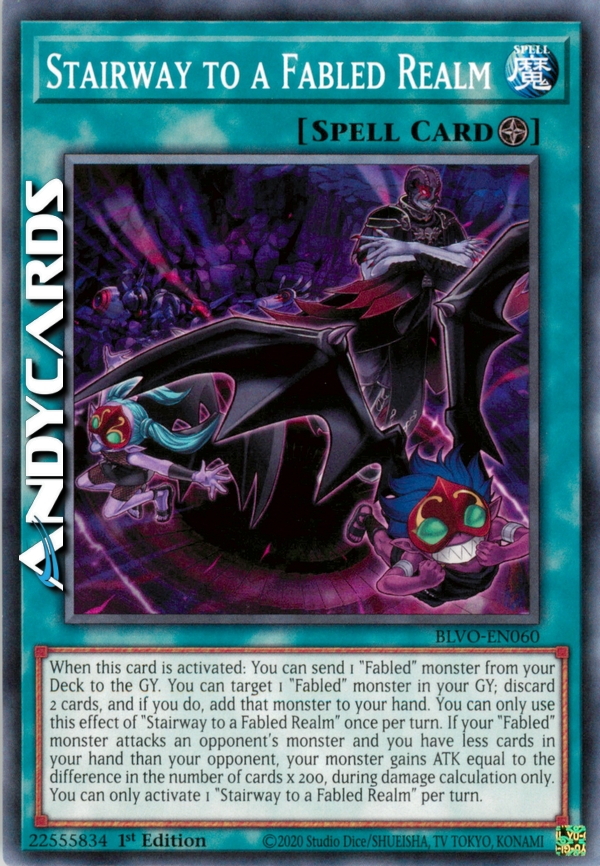 Quando questa carta viene attivata: puoi mandare 1 mostro "Il Favoloso" dal tuo Deck al Cimitero. Puoi scegliere come bersaglio 1 mostro "Il Favoloso" nel tuo Cimitero; scarta 2 carte e, se lo fai, aggiungi quel mostro alla tua mano. Puoi utilizzare questo effetto di "Scalinata verso Il Favoloso Reame" una sola volta per turno. Se un tuo mostro "Il Favoloso" attacca un mostro dell'avversario e tu hai meno carte nella tua mano del tuo avversario, il tuo mostro guadagna ATK pari alla differenza nel numero di carte x 200, solamente durante il calcolo dei danni. Puoi attivare solo 1 "Scalinata verso Il Favoloso Reame" per turno.