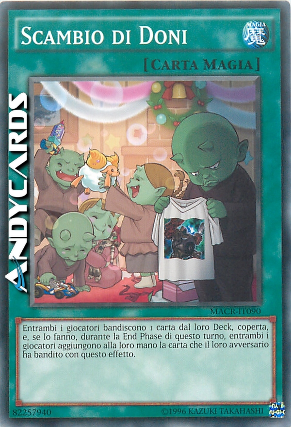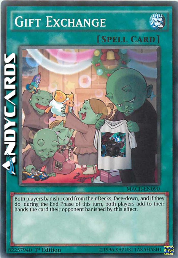 Entrambi i giocatori bandiscono 1 carta dal loro Deck, coperta, e, se lo fanno, durante la End Phase di questo turno, entrambi i giocatori aggiungono alla loro mano la carta che il loro avversario ha bandito con questo effetto.
