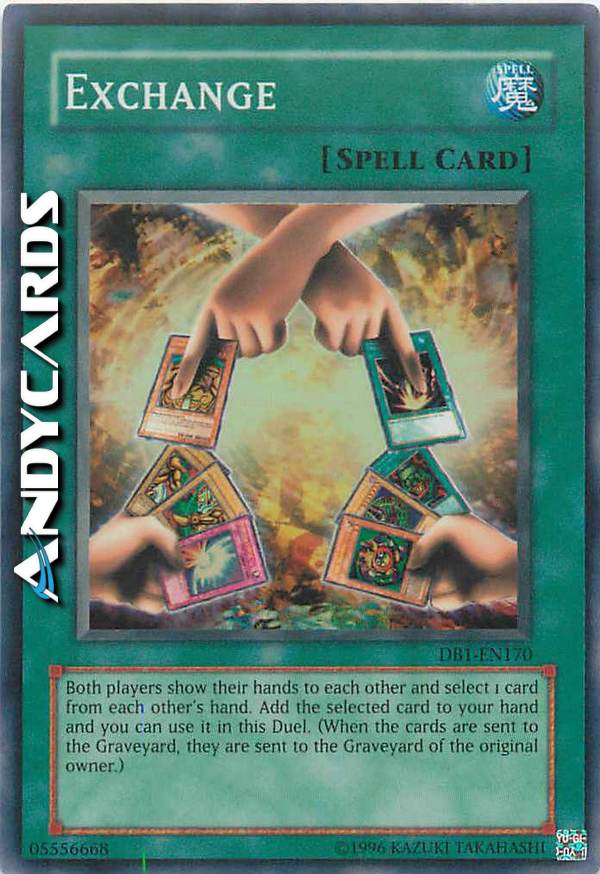 Both players show their hands to each other and select 1 card from each other's hand. Add the selected card to your hand and you can use it in this Duel. (When the cards are sent to the Graveyard, they are sent to the Graveyard of the original owner.)