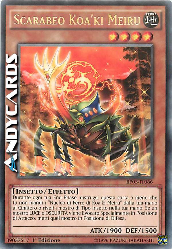 Durante ogni tua End Phase, distruggi questa carta a meno che tu non mandi 1 "Nucleo di Ferro di Koa'ki Meiru" dalla tua mano al Cimitero o riveli 1 mostro di Tipo Insetto nella tua mano. Quando un mostro LUCE o OSCURITA' viene Evocato Specialmente scoperto in Posizione di Attacco, metti il mostro Evocato in Posizione di Difesa.
