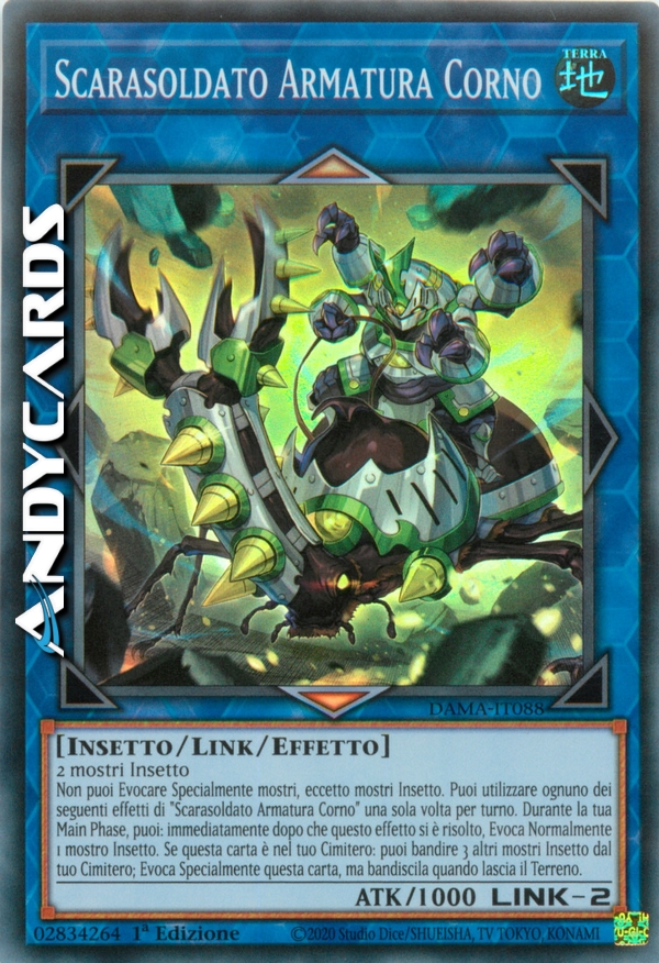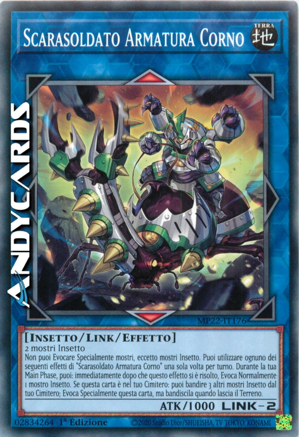 Non puoi Evocare Specialmente mostri, eccetto mostri Insetto. Puoi utilizzare ognuno dei seguenti effetti di "Scarasoldato Armatura Corno" una sola volta per turno. Durante la tua Main Phase, puoi: immediatamente dopo che questo effetto si è risolto, Evoca Normalmente 1 mostro Insetto. Se questa carta è nel tuo Cimitero: puoi bandire 3 altri mostri Insetto dal tuo Cimitero; Evoca Specialmente questa carta, ma bandiscila quando lascia il Terreno.