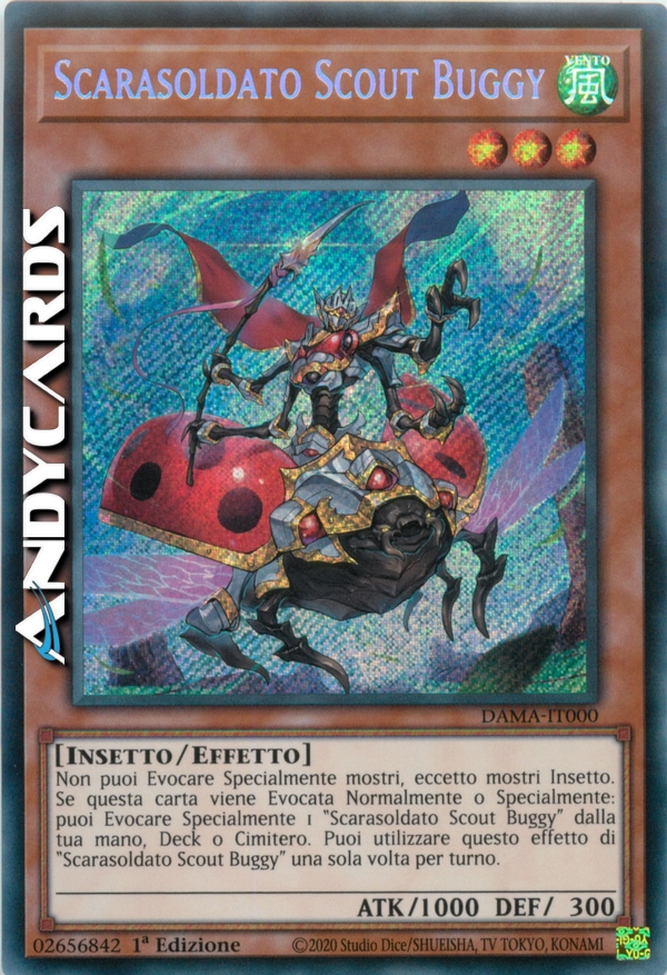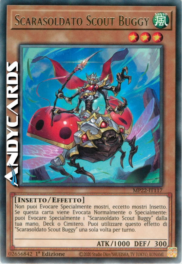 Non puoi Evocare Specialmente mostri, eccetto mostri Insetto. Se questa carta viene Evocata Normalmente o Specialmente: puoi Evocare Specialmente 1 "Scarasoldato Scout Buggy" dalla tua mano, Deck o Cimitero. Puoi utilizzare questo effetto di "Scarasoldato Scout Buggy" una sola volta per turno.