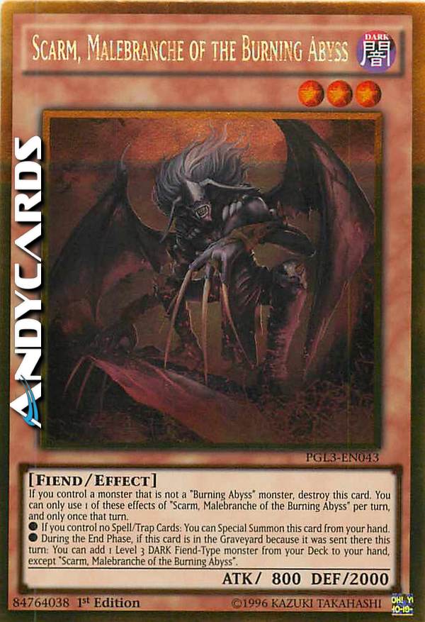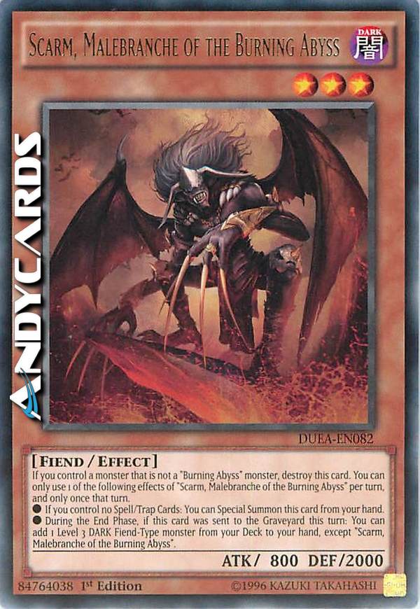 If you control a monster that is not a "Burning Abyss" monster, destroy this card. You can only use 1 of these effects of "Scarm, Malebranche of the Burning Abyss" per turn, and only once that turn.