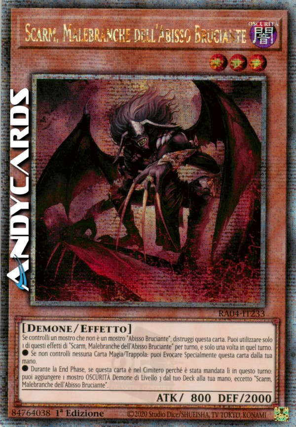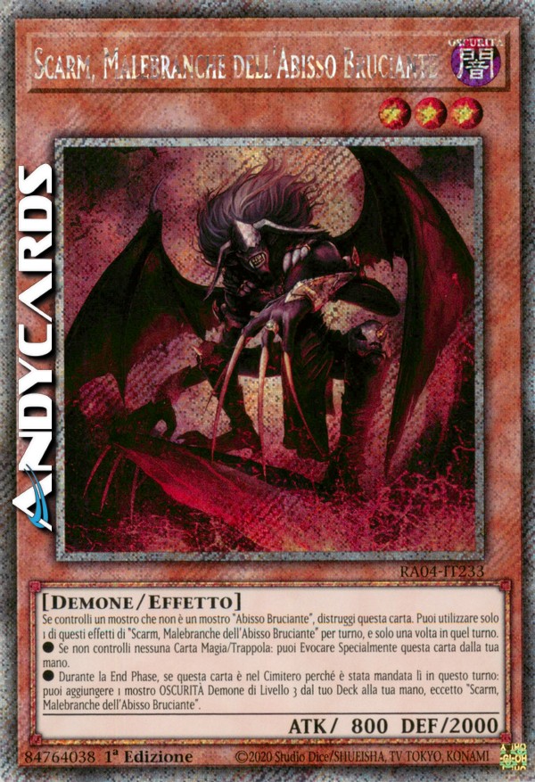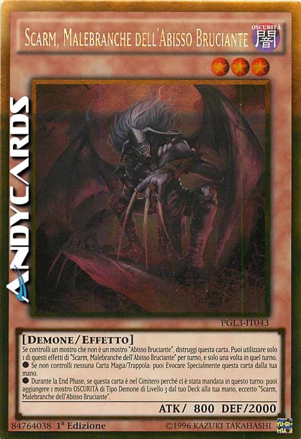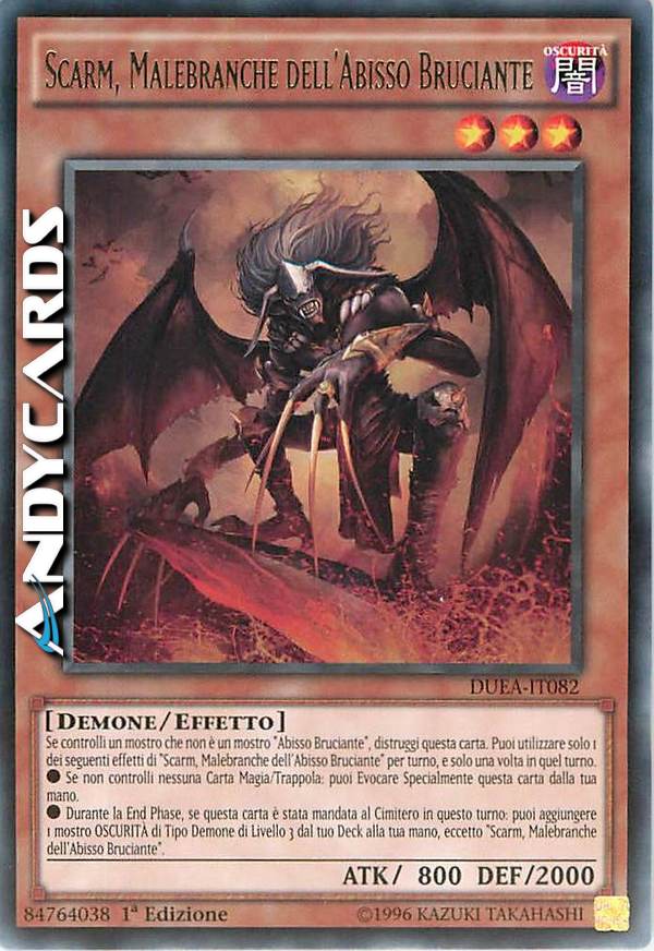 Se controlli un mostro che non è un mostro "Abisso Bruciante, distruggi questa carta. Puoi utilizzare solo 1 dei seguenti effetti di "Scarm, Malebranche dell'Abisso Bruciante" per turno, e solo una volta in quel turno.