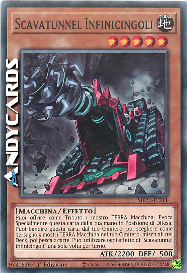 Puoi offrire come Tributo 1 mostro TERRA Macchina; Evoca Specialmente questa carta dalla tua mano in Posizione di Difesa. Puoi bandire questa carta dal tuo Cimitero, poi scegliere come bersaglio 5 mostri TERRA Macchina nel tuo Cimitero; mischiali nel Deck, poi pesca 2 carte. Puoi utilizzare ogni effetto di "Scavatunnel Infinicingoli" una sola volta per turno.