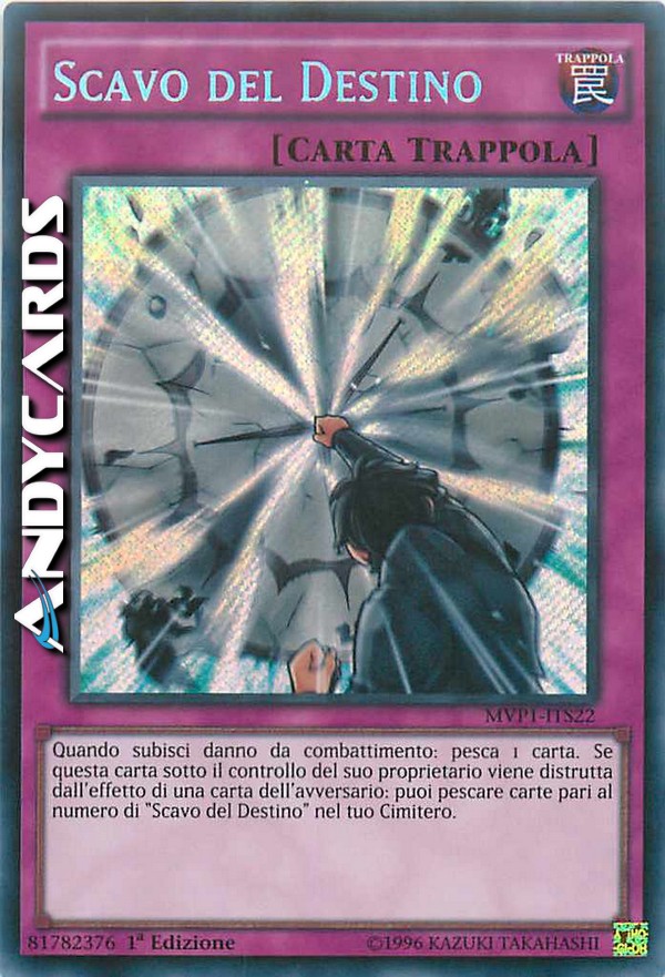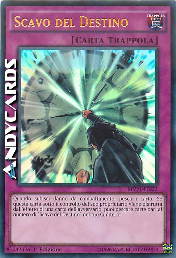 Quando subisci danno da combattimento: pesca 1 carta. Se questa carta sotto il controllo del suo proprietario viene distrutta dall'effetto di una carta dell'avversario: puoi pescare carte pari al numero di "Scavo del Destino" nel tuo Cimitero.