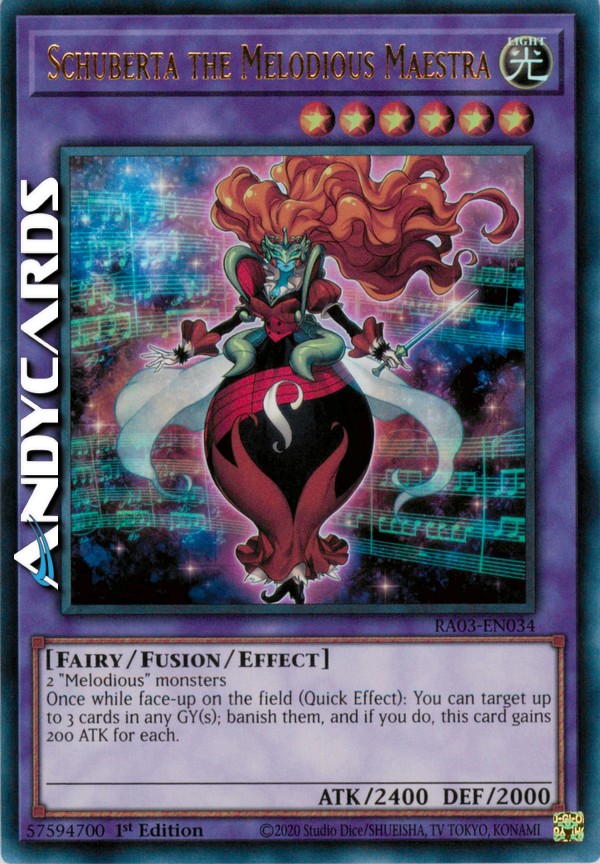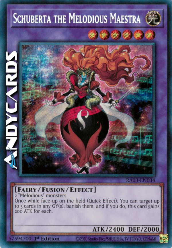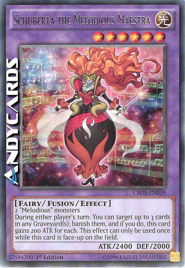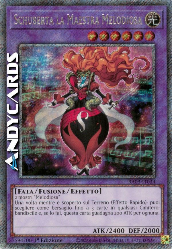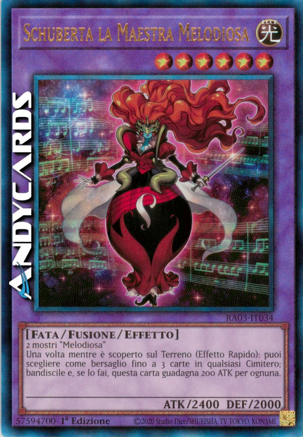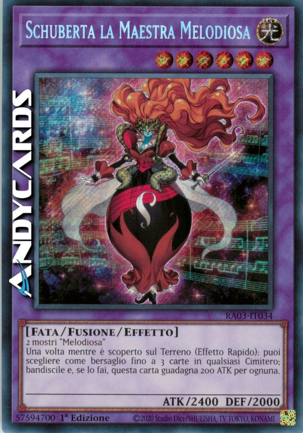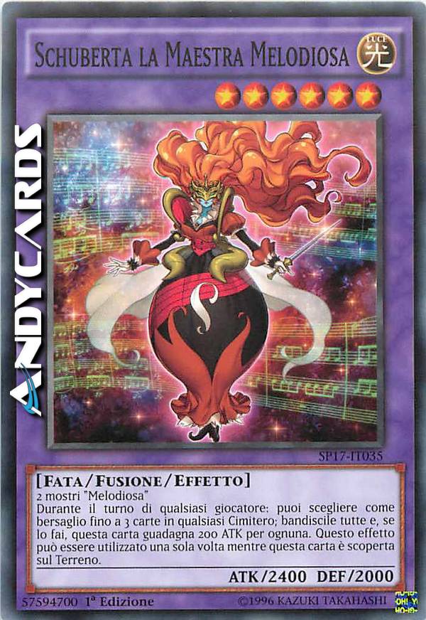 2 mostri "Melodiosa" - Durante il turno di qualsiasi giocatore: puoi scegliere come bersaglio fino a 3 carte in qualsiasi Cimitero; bandiscile tutte e, se lo fai, questa carta guadagna 200 ATK per ognuna. Questo effetto può essere utilizzato una sola volta mentre questa carta è scoperta sul Terreno.