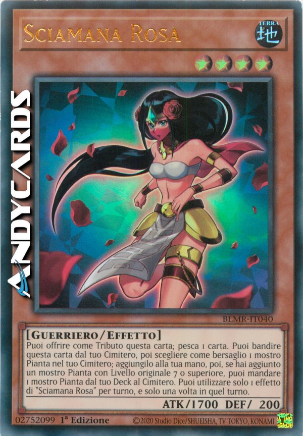Puoi offrire come Tributo questa carta; pesca 1 carta. Puoi bandire questa carta dal tuo Cimitero, poi scegliere come bersaglio 1 mostro Pianta nel tuo Cimitero; aggiungilo alla tua mano, poi, se hai aggiunto un mostro Pianta con Livello originale 7 o superiore, puoi mandare 1 mostro Pianta dal tuo Deck al Cimitero. Puoi utilizzare solo 1 effetto di "Sciamana Rosa" per turno, e solo una volta in quel turno.