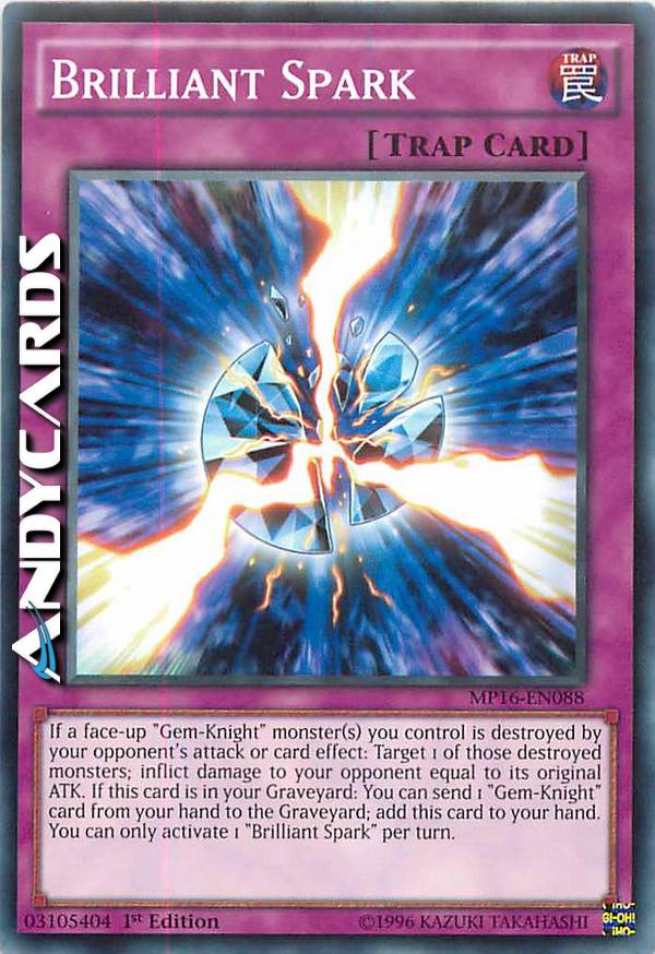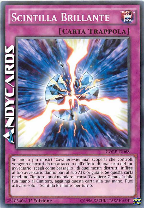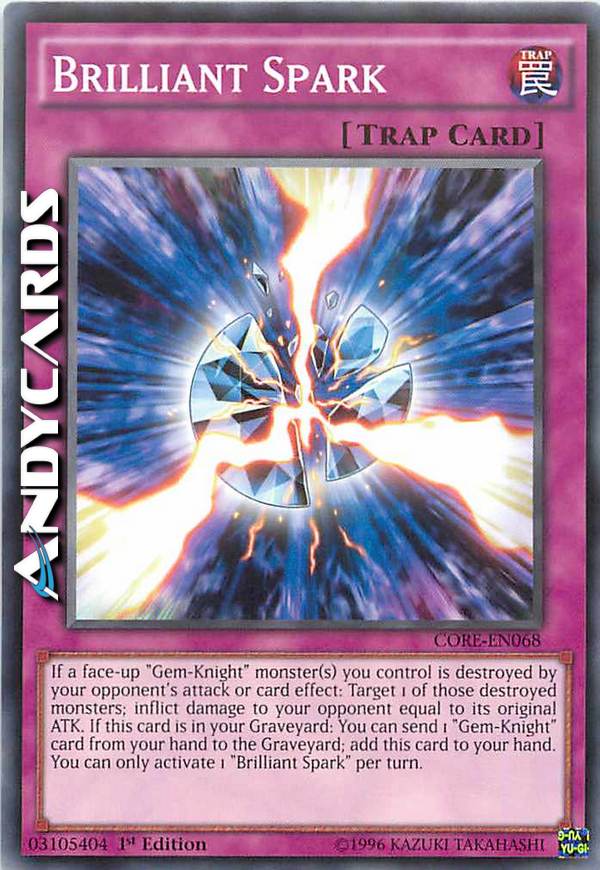 Se uno o più mostri "Cavaliere-Gemma" scoperti che controlli vengono distrutti da un attacco o dall'effetto di una carta del tuo avversario: scegli come bersaglio 1 di quei mostri distrutti; infliggi al tuo avversario danno pari al suo ATK originale. Se questa carta è nel tuo Cimitero: puoi mandare 1 carta "Cavaliere-Gemma" dalla tua mano al Cimitero; aggiungi questa carta alla tua mano. Puoi attivare solo 1 "Scintilla Brillante" per turno.