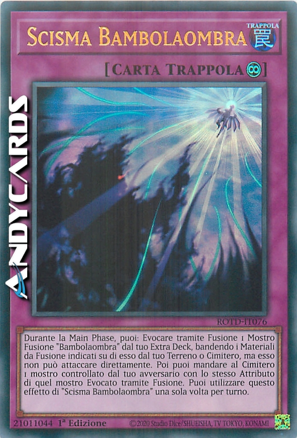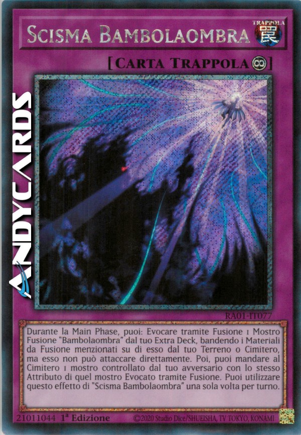 Durante la Main Phase, puoi: Evocare tramite Fusione 1 Mostro Fusione "Bambolaombra" dal tuo Extra Deck, bandendo i Materiali da Fusione menzionati su di esso dal tuo Terreno o Cimitero, ma esso non può attaccare direttamente. Poi, puoi mandare al Cimitero 1 mostro controllato dal tuo avversario con lo stesso Attributo di quel mostro Evocato tramite Fusione. Puoi utilizzare questo effetto di "Scisma Bambolaombra" una sola volta per turno.