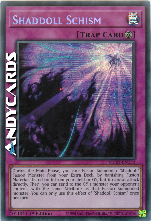 During the Main Phase, you can: Fusion Summon 1 "Shaddoll" Fusion Monster from your Extra Deck, by banishing Fusion Materials mentioned on it from your field or GY, but it cannot attack directly. Then, you can send to the GY 1 monster your opponent controls with the same Attribute as that Fusion Summoned monster. You can only use this effect of "Shaddoll Schism" once per turn.