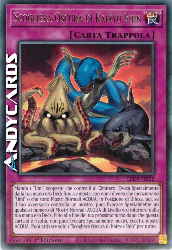 Manda 1 "Umi" scoperto che controlli al Cimitero; Evoca Specialmente dalla tua mano e/o Deck fino a 2 mostri con nomi diversi che menzionano "Umi" o che sono Mostri Normali ACQUA, in Posizione di Difesa, poi, se il tuo avversario controlla un mostro, puoi Evocare Specialmente un qualsiasi numero di Mostri Normali ACQUA di Livello 6 o inferiore dalla tua mano e/o Deck. Fino alla fine del tuo prossimo turno dopo che questa carta si è risolta, non puoi Evocare Specialmente mostri, eccetto mostri ACQUA. Puoi attivare solo 1 "Scogliera Oscura di Kairyu-Shin" per turno.