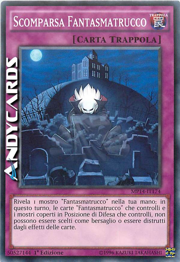Rivela 1 mostro "Fantasmatruco" nella tua mano; in questo turno, le carte "Fantasmatrucco" che controlli e i mostri coperti in Posizione di Difesa che controlli, non possono essere scelti come bersaglio o essere distrutti dagli effetti delle carte.