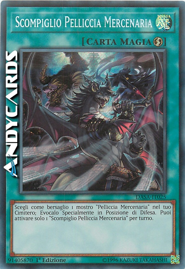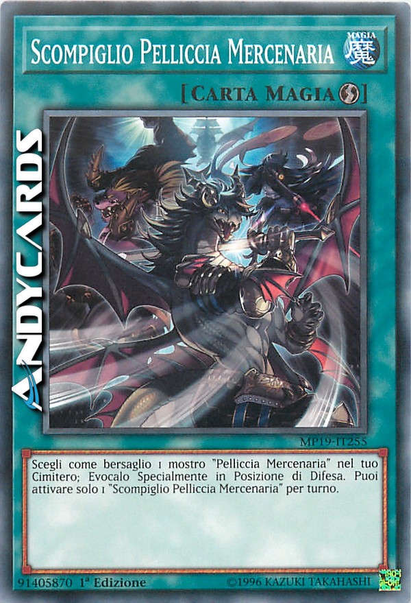 Scegli come bersaglio 1 mostro "Pelliccia Mercenaria" nel tuo Cimitero; Evocalo Specialmente in Posizione di Difesa. Puoi attivare solo 1 "Scompiglio Pelliccia Mercenaria" per turno.