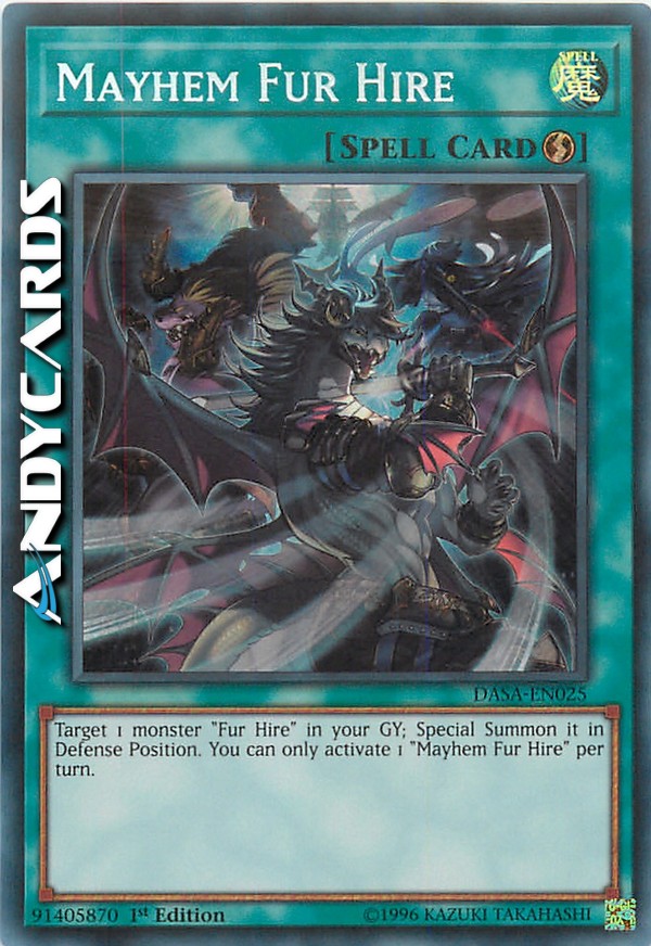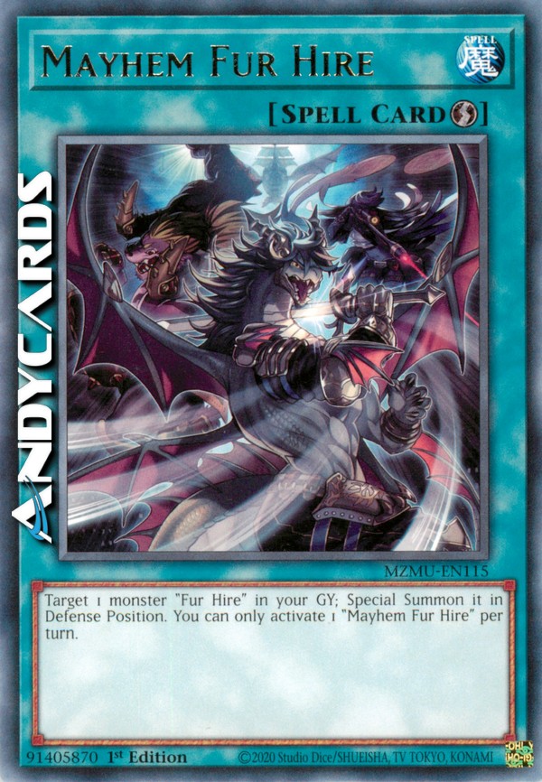 Target 1 monster "Fur Hire" in your GY; Special Summon it in Defense Position. You can only activate 1 "Mayhem Fur Hire" per turn.