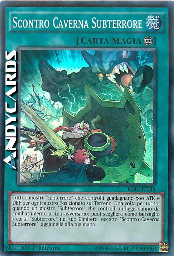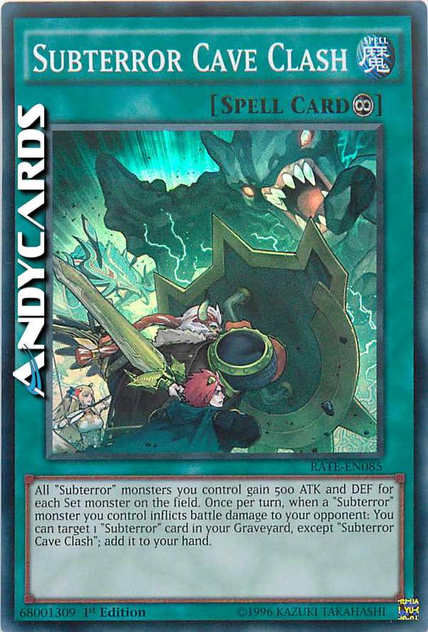 Tutti i mostri "Subterrore" che controlli guadagnano 500 ATK e DEF per ogni mostro Posizionato sul Terreno. Una volta per turno, quando un mostro "Subterrore" che controlli infligge danno da combattimento al tuo avversario: puoi scegliere come bersaglio 1 carta "Subterrore" nel tuo Cimitero, eccetto "Scontro Caverna Subterrore"; aggiungila alla tua mano.