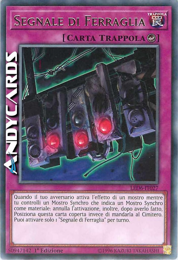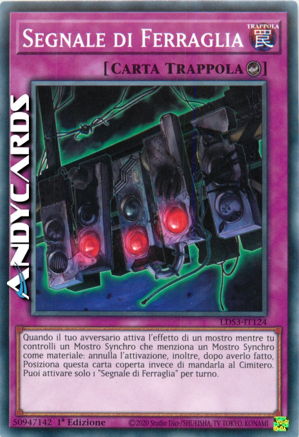 Quando il tuo avversario attiva l'effetto di un mostro mentre tu controlli un Mostro Synchro che indica un Mostro Synchro come materiale: annulla l'attivazione, inoltre, dopo averlo fatto, Posiziona questa carta coperta invece di mandarla al Cimitero. Puoi attivare solo 1 "Segnale di Ferraglia" per turno.