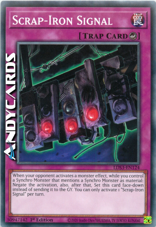 When your opponent activates a monster effect, while you control a Synchro Monster that lists a Synchro Monster as material: Negate the activation, also, after that, Set this card face-down instead of sending it to the GY. You can only activate 1 "Scrap-Iron Signal" per turn.