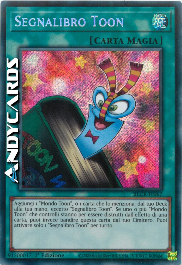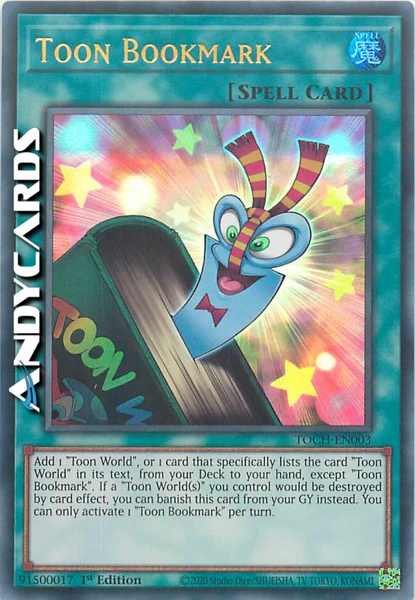 Aggiungi 1 "Mondo Toon", o 1 carta che indica specificamente la carta "Mondo Toon" nel suo testo, dal tuo Deck alla tua mano, eccetto "Segnalibro Toon". Se uno o più "Mondo Toon" che controlli stanno per essere distrutti dall'effetto di una carta, puoi invece bandire questa carta dal tuo Cimitero. Puoi attivare solo 1 "Segnalibro Toon" per turno.
