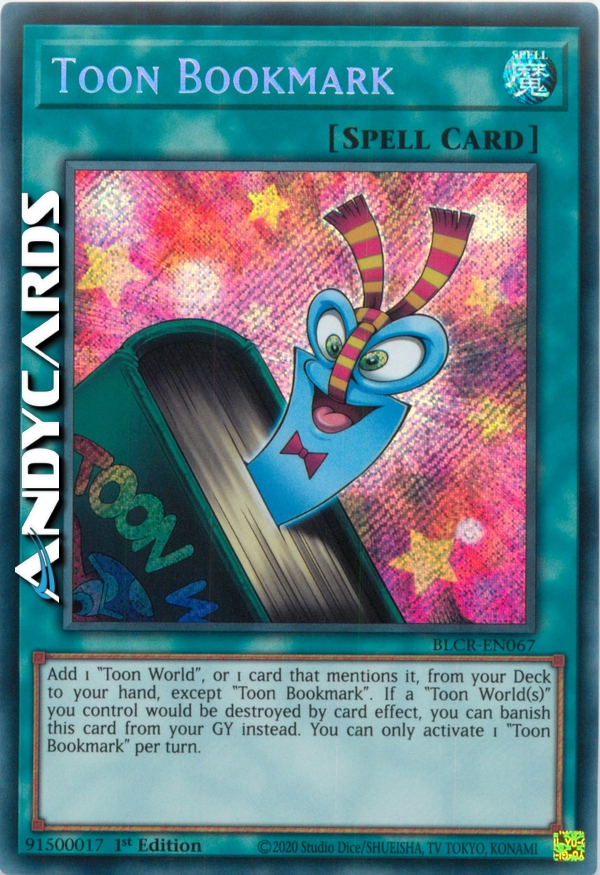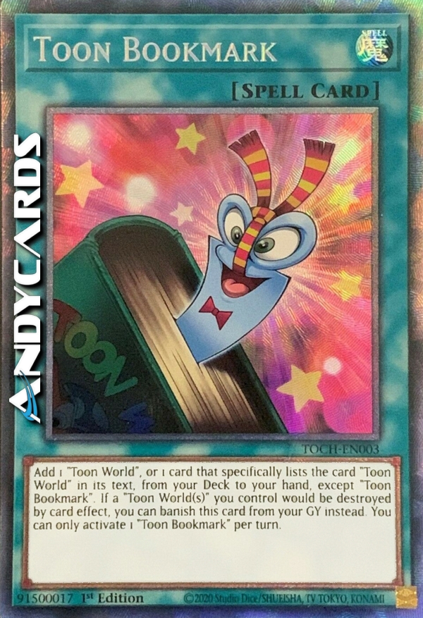 Add 1 "Toon World", or 1 card that specifically lists the card "Toon World" in its text, from your Deck to your hand, except "Toon Bookmark". If a "Toon World(s)" you control would be destroyed by card effect, you can banish this card from your GY instead. You can only activate 1 "Toon Bookmark" per turn.