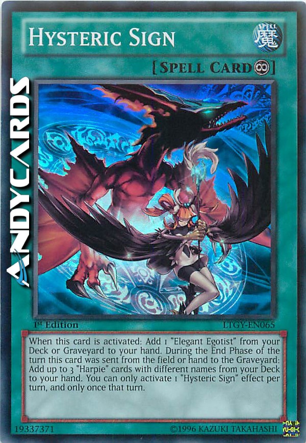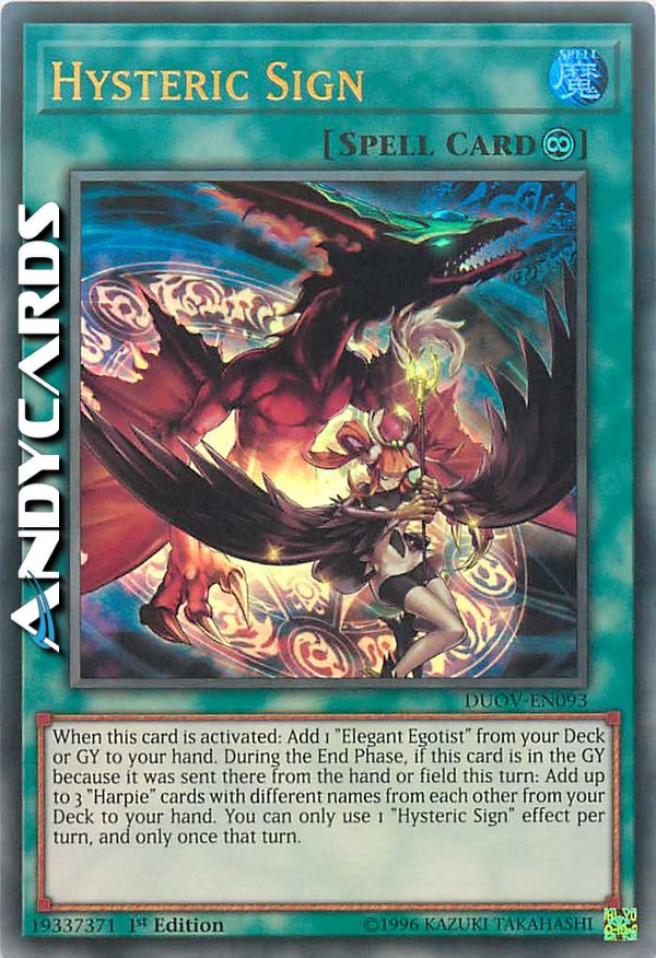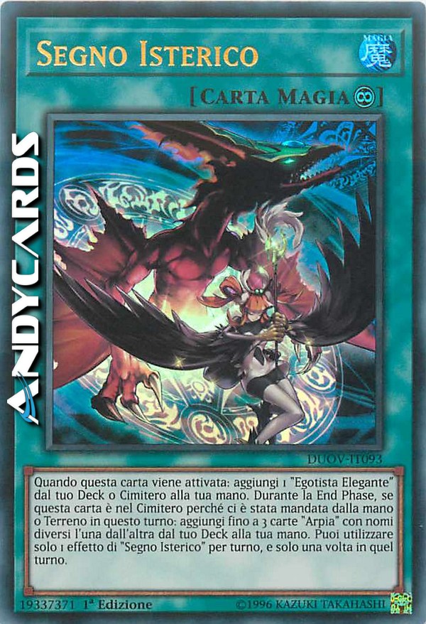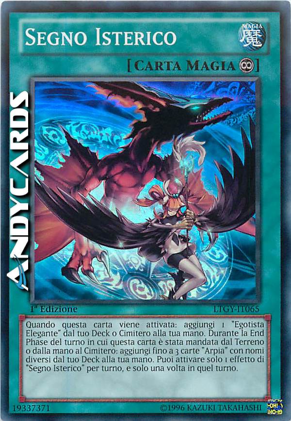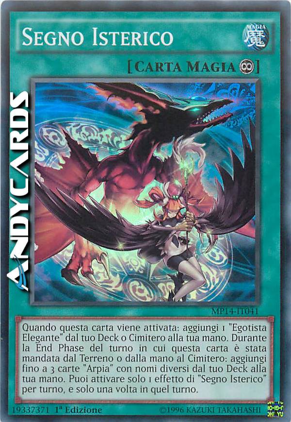 Quando questa carta viene attivata: aggiungi 1 "Egotista Elegante" dal tuo Deck o Cimitero alla tua mano. Durante la End Phase, se questa carta è nel Cimitero perché ci è stata mandata dalla mano o Terreno in questo turno: aggiungi fino a 3 carte "Arpia" con nomi diversi l'una dall'altra dal tuo Deck alla tua mano. Puoi utilizzare solo 1 effetto di "Segno Isterico" per turno, e solo una volta in quel turno.