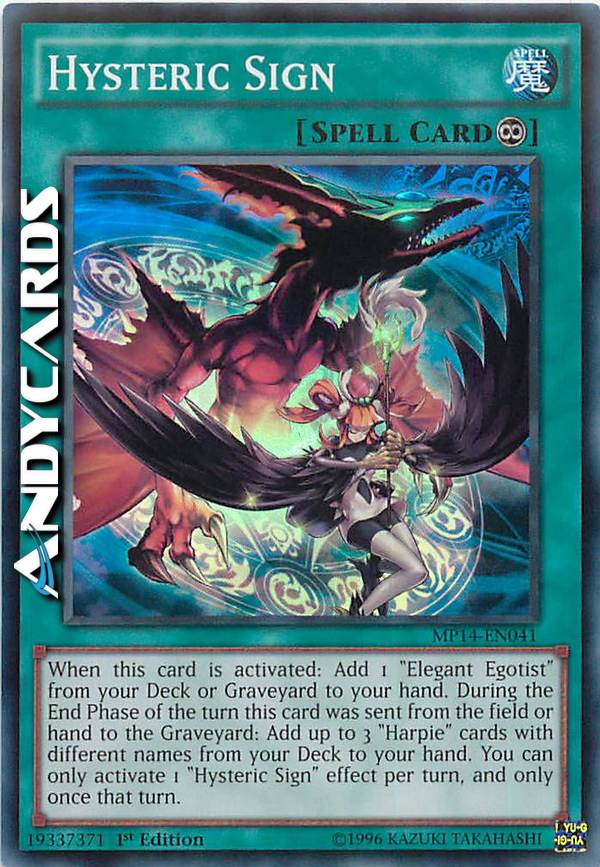 When this card is activated: Add 1 "Elegant Egotist" from your Deck or Graveyard to your hand. During the End Phase of the turn this card was sent from the field or hand to the Graveyard: Add up to 3 "Harpie" cards with different names from your Deck to your hand. You can only activate 1 "Hysteric Sign" effect per turn, and only once that turn.
