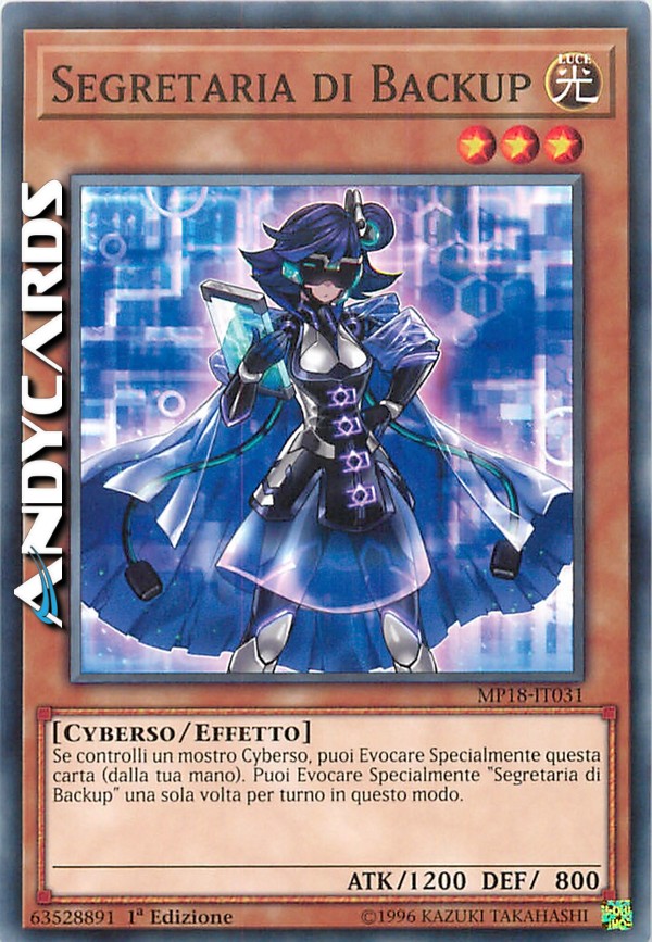 Se controlli un mostro Cyberso, puoi Evocare Specialmente questa carta (dalla tua mano). Puoi Evocare Specialmente "Segretaria di Backup" una sola volta per turno in questo modo.