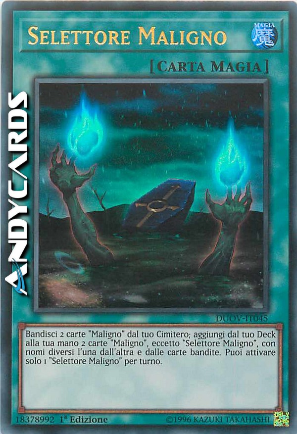 Bandisci 2 carte "Maligno" dal tuo Cimitero; aggiungi dal tuo Deck alla tua mano 2 carte "Maligno", eccetto "Selettore Maligno", con nomi diversi l'una dall'altra e dalle carte bandite. Puoi attivare solo 1 "Selettore Maligno" per turno.