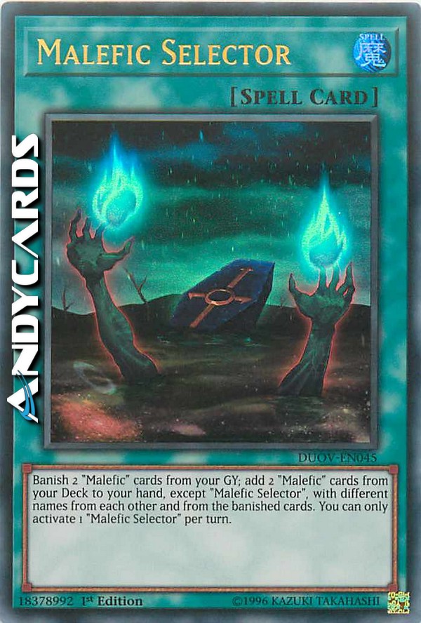 Banish 2 "Malefic" cards from your GY; add 2 "Malefic" cards from your Deck to your hand, except "Malefic Selector", with different names from each other and from the banished cards. You can only activate 1 "Malefic Selector" per turn.