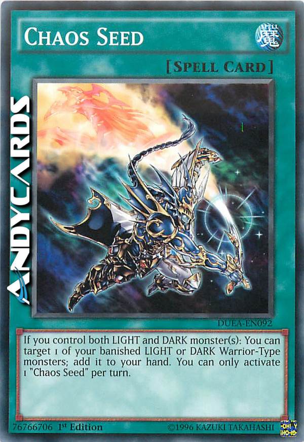 If you control both LIGHT and DARK monster(s): You can target 1 of your banished LIGHT or DARK Warrior-Type monsters; add it to your hand. You can only activate 1 "Chaos Seed" per turn.