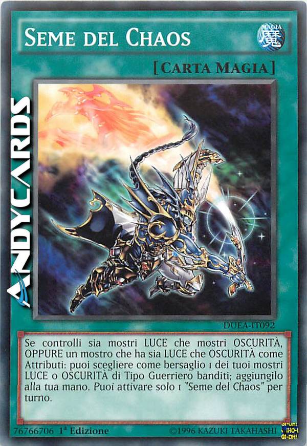 Se controlli sia mostri LUCE che mostri OSCURITA', OPPURE un mostro che ha sia LUCE che OSCURITA'come Attributi: puoi scegliere come bersaglio 1 dei tuoi mostri LUCE o OSCURITA' di Tipo Guerriero banditi; aggiungilo alla tua mano. Puoi attivare solo 1 "Seme del Chaos" per turno.
