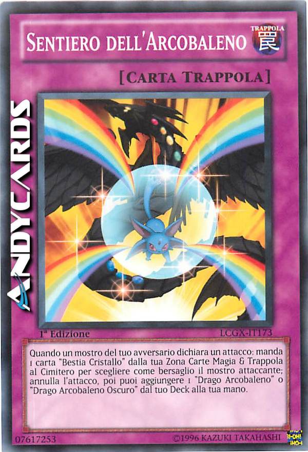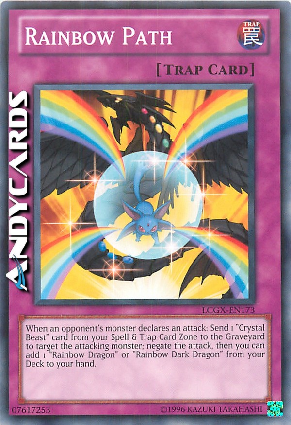 Quando un mostro del tuo avversario dichiara un attacco: manda 1 carta "Bestia Cristallo" dalla tua Zona Carte Magia & Trappola al Cimitero per scegliere come bersaglio il mostro attaccante; annulla l'attacco, poi puoi aggiungere 1 "Drago Arcobaleno" o "Drago Arcobaleno Oscuro" dal tuo Deck alla tua mano.