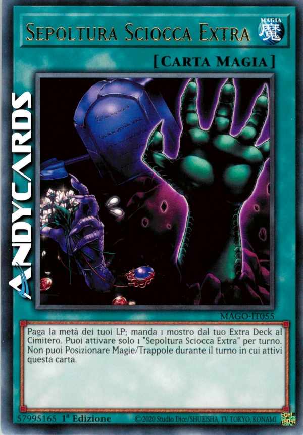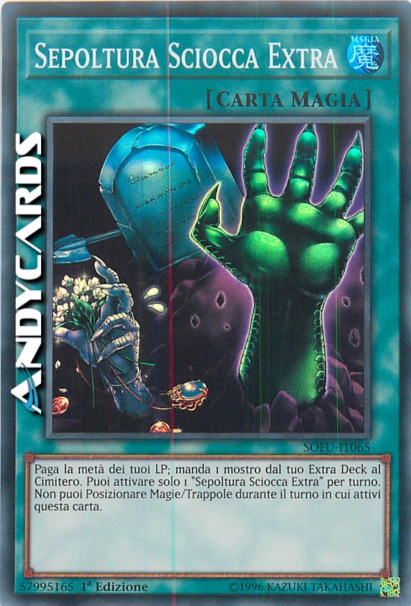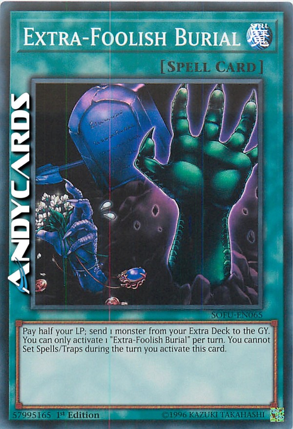 Paga la metà dei tuoi LP; manda 1 mostro dal tuo Extra Deck al Cimitero. Puoi attivare solo 1 "Sepoltura Sciocca Extra" per turno. Non puoi Posizionare Magie/Trappole durante il turno in cui attivi questa carta.