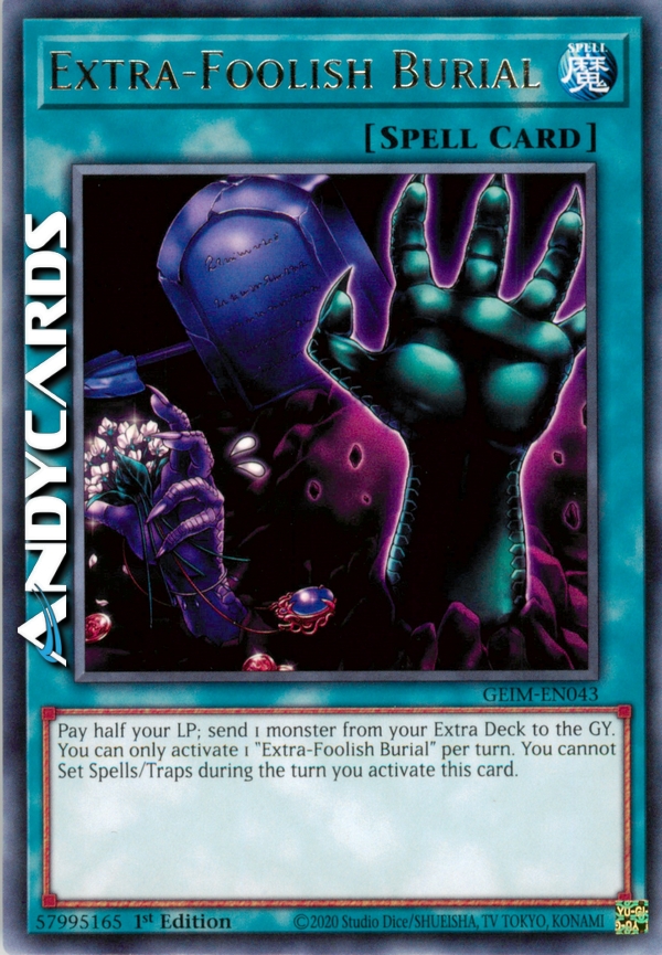 Pay half your LP; send 1 monster from your Extra Deck to the GY. You can only activate 1 "Extra-Foolish Burial" per turn. You cannot Set Spells/Traps during the turn you activate this card.
