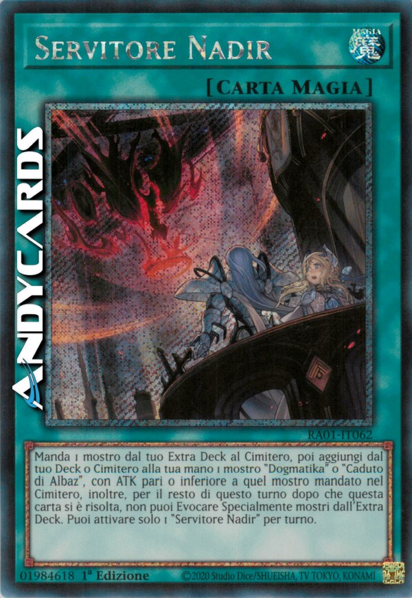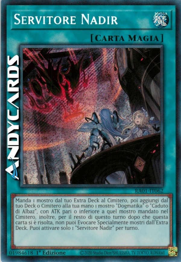 Manda 1 mostro dal tuo Extra Deck al Cimitero, poi aggiungi dal tuo Deck o Cimitero alla tua mano 1 mostro "Dogmatika" o "Caduto di Albaz", con ATK pari o inferiore a quel mostro mandato nel Cimitero, inoltre, per il resto di questo turno dopo che questa carta si è risolta, non puoi Evocare Specialmente mostri dall'Extra Deck. Puoi attivare solo 1 "Servitore Nadir" per turno.