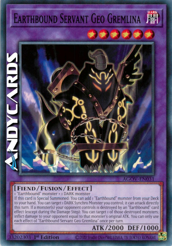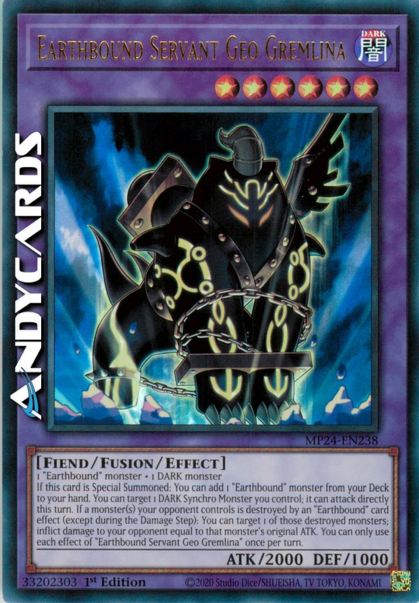 If this card is Special Summoned: You can add 1 "Earthbound" monster from your Deck to your hand. You can target 1 DARK Synchro Monster you control; it can attack directly this turn. If a monster(s) your opponent controls is destroyed by an "Earthbound" card effect (except during the Damage Step): You can target 1 of those destroyed monsters; inflict damage to your opponent equal to that monster's original ATK. You can only use each effect of "Earthbound Servant Geo Gremlina" once per turn.