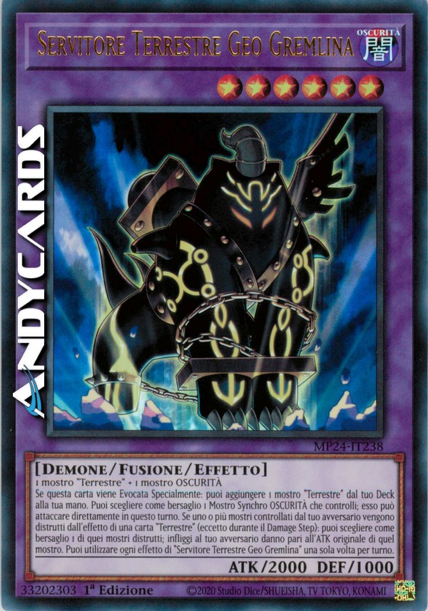 Se questa carta viene Evocata Specialmente: puoi aggiungere 1 mostro "Terrestre" dal tuo Deck alla tua mano. Puoi scegliere come bersaglio 1 Mostro Synchro OSCURITÀ che controlli; esso può attaccare direttamente in questo turno. Se uno o più mostri controllati dal tuo avversario vengono distrutti dall'effetto di una carta "Terrestre" (eccetto durante il Damage Step): puoi scegliere come bersaglio 1 di quei mostri distrutti; infliggi al tuo avversario danno pari all'ATK originale di quel mostro. Puoi utilizzare ogni effetto di "Servitore Terrestre Geo Gremlina" una sola volta per turno.