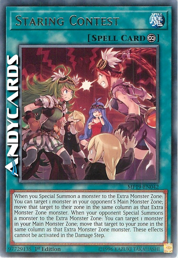 When you Special Summon a monster to the Extra Monster Zone: You can target 1 monster in your opponent's Main Monster Zone; move that target to their zone in the same column as that Extra Monster Zone monster. When your opponent Special Summons a monster to the Extra Monster Zone: You can target 1 monster in your Main Monster Zone; move that target to your zone in the same column as that Extra Monster Zone monster. These effects cannot be activated in the Damage Step.