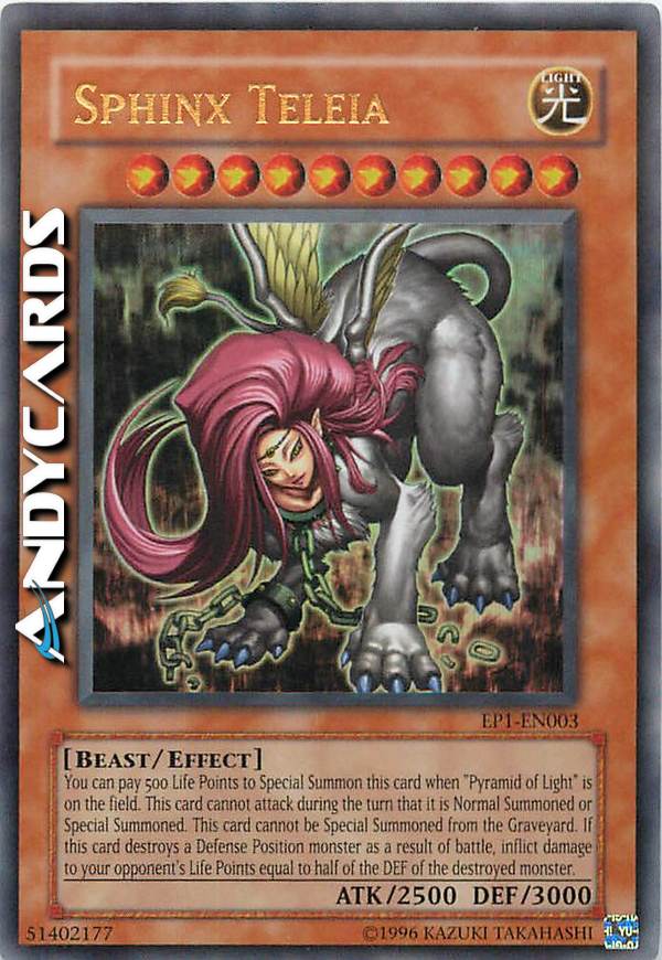 You can pay 500 Life Points to Special Summon this card when "Pyramid of Light" is on the field. This card cannot attack during the turn it was Normal Summoned or Special Summoned. This card cannot be Special Summoned from the Graveyard. If this card destroys a Defense Position monster as a result of battle, inflict damage to your opponent's Life Points equal to half of the DEF of the destroyed monster.