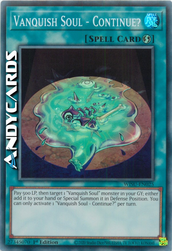 Pay 500 LP, then target 1 "Vanquish Soul" monster in your GY; either add it to your hand or Special Summon it in Defense Position. You can only activate 1 "Vanquish Soul - Continue?" per turn.
