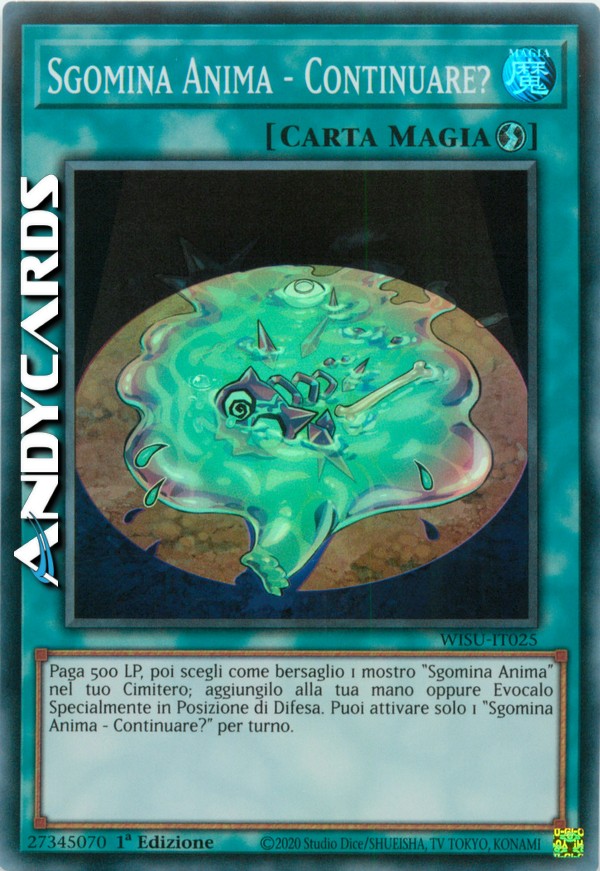 Paga 500 LP, poi scegli come bersaglio 1 mostro "Sgomina Anima" nel tuo Cimitero; aggiungilo alla tua mano oppure Evocalo Specialmente in Posizione di Difesa. Puoi attivare solo 1 "Sgomina Anima - Continuare?" per turno.