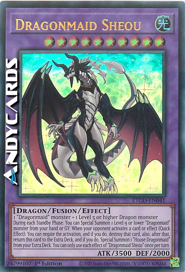 During each Standby Phase: You can Special Summon 1 Level 9 or lower "Dragonmaid" monster from your hand or GY. When your opponent activates a card or effect (Quick Effect): You can negate the activation, and if you do, destroy that card, also, after that, return this card to the Extra Deck, and if you do, Special Summon 1 "House Dragonmaid" from your Extra Deck. You can only use each effect of "Dragonmaid Sheou" once per turn.
