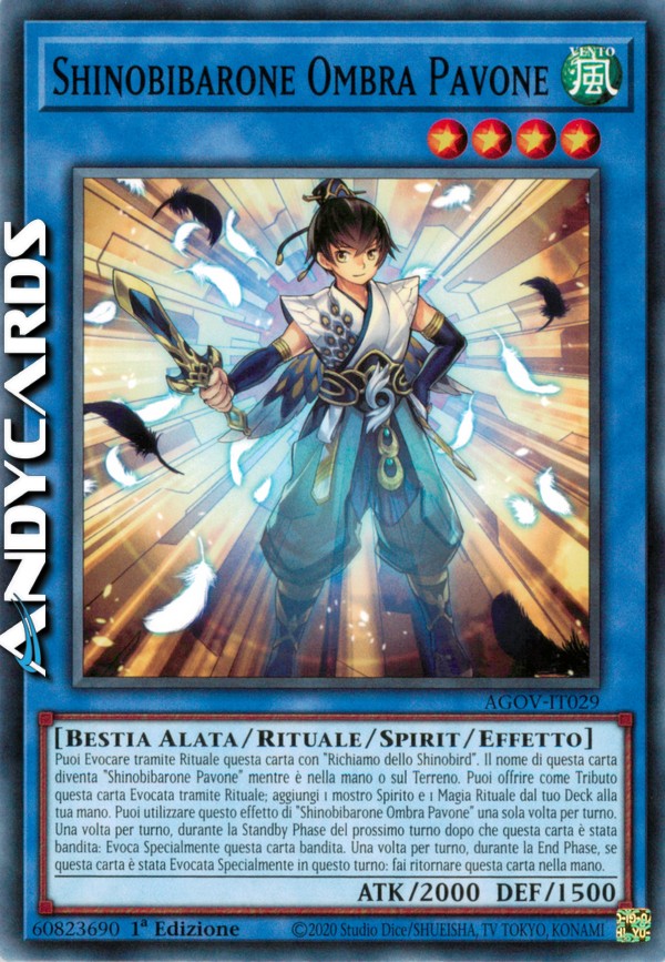 Puoi Evocare tramite Rituale questa carta con "Richiamo dello Shinobird". Il nome di questa carta diventa "Shinobibarone Pavone" mentre è nella mano o sul Terreno. Puoi offrire come Tributo questa carta Evocata tramite Rituale; aggiungi 1 mostro Spirito e 1 Magia Rituale dal tuo Deck alla tua mano. Puoi utilizzare questo effetto di "Shinobibarone Ombra Pavone" una sola volta per turno. Una volta per turno, durante la Standby Phase del prossimo turno dopo che questa carta è stata bandita: Evoca Specialmente questa carta bandita. Una volta per turno, durante la End Phase, se questa carta è stata Evocata Specialmente in questo turno: fai ritornare questa carta nella mano.
