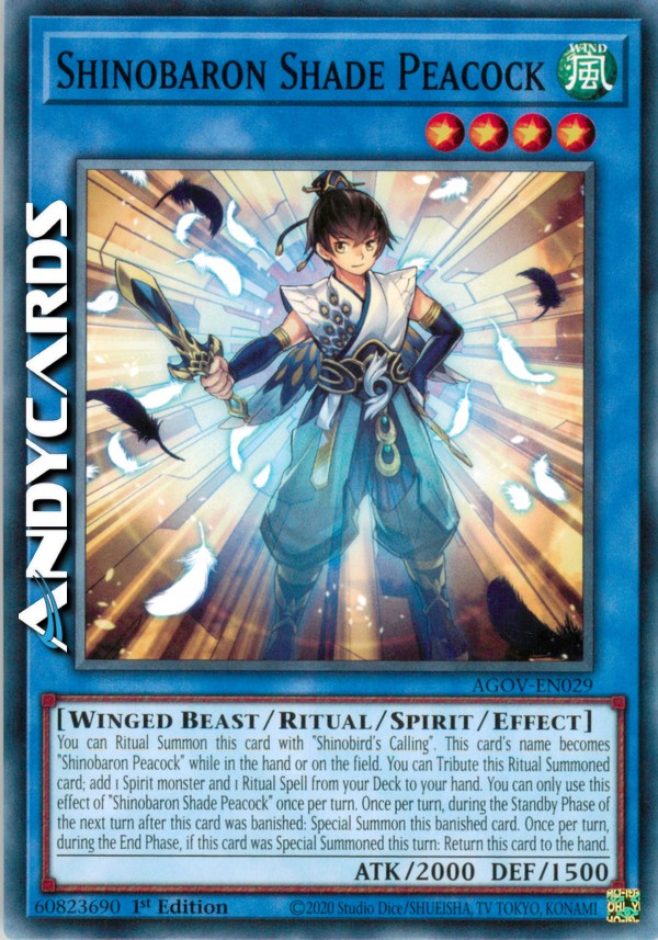 You can Ritual Summon this card with "Shinobird's Calling". This card's name becomes "Shinobaron Peacock" while in the hand or on the field. You can Tribute this Ritual Summoned card; add 1 Spirit monster and 1 Ritual Spell from your Deck to your hand. You can only use this effect of "Shinobaron Shade Peacock" once per turn. Once per turn, during the Standby Phase of the next turn after this card was banished: Special Summon this banished card. Once per turn, during the End Phase, if this card was Special Summoned this turn: Return this card to the hand.